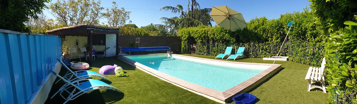 La piscine au sel est protégée par une clôture et une alarme, elle est partagée avec les trois autres gîtes.